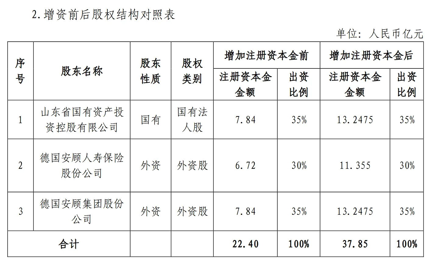 议案内容概述如下:公司股东向德华安顾人寿保险有限公司拟增资15.45亿元人民币,增资后,股东出资比例如下:山东省国有资产投资控股有限公司出资5.4075亿元,出资比例为35%;德国安顾集团股份公司出资5.4075亿元,出资比例为35%;德国安顾人寿保险股份公司出资4.635亿元,出资比例为30%。